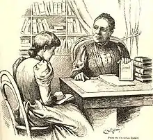 In 1846, Crosby was an instructor at the NYIB and was listed as a "graduate pupil".[32] She subsequently joined the school's faculty, teaching grammar, rhetoric, and history;[53] she remained there until three days before her wedding on March 5, 1858. While teaching at the NYIB, she befriended future US president Grover Cleveland[54] then aged 17.[55] The two spent many hours together at the end of each day, and he often transcribed the poems that she dictated to him.[55][56] He wrote for her a recommendation which was published in her 1906 autobiography.[55] She wrote a poem that was read at the dedication of Cleveland's birthplace in Caldwell, New Jersey in March 1913, being unable to attend due to her health.[55][57]