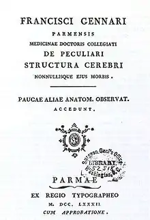 Francesco Gennari (born 4 October 1750 Mattaleto di Langhirano; died 4 December 1797) was an Italian anatomist. He is known for line of Gennari, a macroscopically white band seen in the cerebral cortex of the occipital lobe, which he observed on 2 February 1776 in the course of examining frozen sections of unstained human brain during his study in medical school. He mentioned it in his book De peculiari structura cerebri, nonnulisque ejus morbis, and referred to it as lineola albidior.