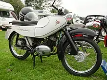 Francis Barnett was amalgamated with Associated Motor Cycles in 1947. About that time Francis Barnett brought back the Cruiser names with a 171cc AMC engined Light Cruiser.[6] The motorcycles Plover, Falcon and Cruiser were successful right into the 1950s as good light machines in Arden Green rather than the black finish of earlier days. James vehicles were in maroon. AMC considered Wolverhampton based Villiers to be dictatorial and they commissioned Italian designer Vincenzo Piatti to design a new engine to replace the Villier' engine. The Villiers engine was discontinued in new models in favour of AMC's Piatti designed unit. Unfortunately this did not work well due to cost and unreliability of the AMC manufactured engine.[20] AMC reverted Francis Barnett bikes back to a Villiers engine again.[21] The Falcon 87 with a 199cc single cylinder two stroke AMC engine was introduced and remained in production until 1966. Also that year the Cruiser 84 with a fully enclosed rear wheel and leg shields as standard equipment was available. The first Cruiser was made in 1932 and is a quiet machine made for riders where special wet proof clothing was not required. The engine being enclosed with good leg-shield and mudguard protection. The Cruiser is displayed at Lord Montague's National Motor Museum, Beaulieu.[22][23]