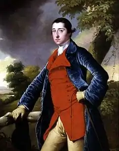 Burdett was the brother-in-law of Francis Mundy and a member of the private Markeaton Hunt. In 1762–3 Mundy commissioned a set of six portraits. Each of the subjects was in the distinctive dress of the Markeaton Hunt, consisting of a blue coat over a scarlet waistcoat and yellow breeches. These paintings hung at Mundy's ancestral home, Markeaton Hall.[2] A year or so later there was another portrait by Francis Cotes.