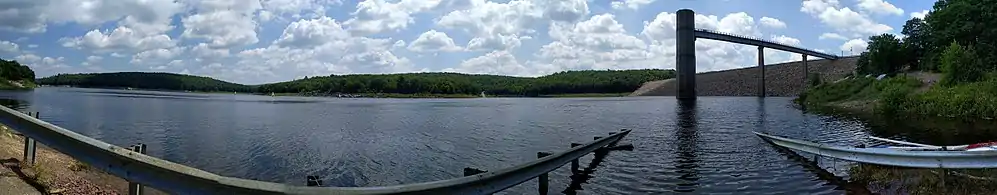 ![]() Outlet and reservoir view of the Francis E. Walter Dam. The outlet can be seen at the bottom left and the reservoir at the top. Bear Creek flows into the reservoir from the left, while the Lehigh River flows from the right. | |