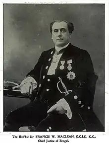 Maclean was made a Q.C. in 1886. After resigning his seat he was Master in Lunacy until 1896, becoming a bencher in 1892. From 1896 to 1909 he was Chief Justice of Bengal. He was knighted in 1896,[4] appointed K.C.I.E. in 1898,[5] and awarded the Kaisar-i-Hind Medal in 1900.[6] His career in India included the chairmanship of famine relief committees in 1897, 1900 and 1907, as well as a short spell as Vice-Chancellor of the University of Calcutta between 1898 and 1900.