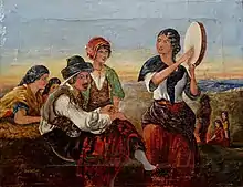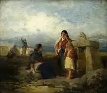 The earliest of Topham's Spanish subjects appeared in 1854, when he exhibited Fortune Telling — Andalusia, and Spanish Gypsies 29,5 x 38,5 cm. These paintings were followed by The Andalusian Letter-Writer and The Posada in 1855, Spanish Card-players and Village Musicians in Brittany in 1857, Spanish Gossip in 1859, and others, mainly Spanish. In the autumn of 1860 he paid a return visit to Ireland, and in 1861 exhibited The Angel's Whisper and Irish Peasants at the Holy Well. In 1864 he began to exhibit Italian drawings, sending Italian Peasants and The Fountain at Capri, and in 1870 A Venetian Well.[1]