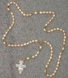 The Franciscan Crown (or Seraphic Rosary) is a rosary consisting of seven decades in commemoration of the Seven Joys of the Virgin, namely, the Annunciation, the Visitation, the Nativity of Jesus, the Adoration of the Magi, the Finding in the Temple, the Resurrection of Jesus, and finally, either or both the Assumption of Mary and the Coronation of the Virgin. Devotion to the seven joys of Mary is found in a variety of forms and communities. It is especially popular with the Franciscans, Cistercians, and the Annunciades of St. Joan of France. The devotion was granted many indulgences by different Popes, becoming the most heavily indulgenced devotion in the Church. In order for any associated indulgences to be received it was not necessary for a Franciscan rosary to have been blessed or even to use beads at all.[1]