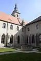 On the squared plan there is cross corridor which is on each side vaulted by four serveries of cross vaulting without the corner serveries. In the other parts of corridor there are vaulting ribs led to the wall without consoles. There where vaulting ribs cross there are sometimes bosses but not in every servery. The bosses are shaped partially like plates and are partially circular. Cloister goes around squared garden, which is possible to be seen through Gothic windows with flute profile. The garden is accessible from western wing through the doorway with a shouldered arch. In the eastern part of cloister there is late Gothic decorated pulpit from 1543 and small scriptorium. On some places we can still see late Gothic fresco.
