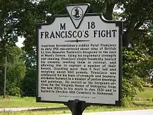 Francisco's Fight is the name commonly given to an alleged skirmish between a detachment of Tarleton's Raiders and Peter Francisco, a Continental Army soldier with a long service record, during the American Revolutionary War in July 1781. The skirmish, which is only known to be documented by Francisco, resulted in the death of at least one man and the wounding of several others.