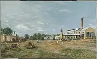 Oller was a prolific painter with works ranging in topic from still-lifes and landscapes to historical events and portraiture.[8] While he was involved with several painting movements, Realism, Naturalism and Impressionism; he is best known for his Impressionist works.[8] Oller’s style of painting made him stand out among the many artists that took part in the depiction of Puerto Rico’s lush tropical landscapes of both rural and urban landscapes and provided a realistic image of Puerto Rico compared to the European artists that flocked over to the Caribbean to paint lush, idealized landscapes of the environment. Oller’s main subject matter of focus was everything within Puerto Rico, whether it was still life paintings of plantains and bananas or historical battle scenes. Oller's painting style provided a historical context for his painting, providing a cultural view through his own lens. Oller was involved with many art movements from the realist art movement, the naturalist art movement, and the impressionist art movement of which he is best known for. In his life, Oller spent nearly two decades in Europe working alongside the pioneers of these art movements, drawing influence from them in the evolution of his artwork. One characteristic that is quite apparent in his work that he drew influence from another artist is his sober, unidealized depictions of rural workers in Puerto Rico.
