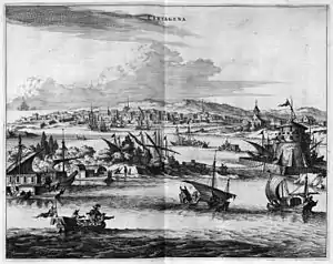 The town was constantly under threat from Dutch privateers, and during his term of office Murga strengthened the eastern fortifications.[2] He ignored the work and views of the Italian engineer Cristóbal de Roda Antonelli, who had spent many years working on the fortifications.[3] With experience in Flanders, Murga wanted to apply the principles of fortification that had been developed there, including opposing trenches and advanced Ravelins to hinder the approach of the enemy.[4] In 1631 he used prisoners from the Anglo-French colonies of Nevis and Saint Kitts to fortify the bridge connecting the city with the Getsemaní suburb, building a Media Luna (half moon) gatehouse.[2] This structure, with its unusual concave crescent wall, made it possible to instantly cut off the city from any approach from the mainland.[4]