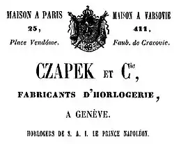 In 1845 Francois Czapek founded Czapek & Cie.[1] with a new partner, Juliusz Gruzewski (1808–1865), a close friend of French Emperor Napoleon III (1808–1873). Czapek's new company flourished. He became watchmaker to the Court of the Emperor Napoleon III ('Fournisseur de la cour - Purveyors to the Imperial Court") and had an Atelier in Geneva, a shop in Paris, Place Vendome 28 (established 1850), and another in Warsaw (established 1854).