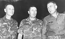 Garretson (left) congratulates newly promoted BrigGen. Mauro J. Padalino (center) on his promotion to new rank. BrigGen. Robert B. Carney Jr. looks on, Camp Courtney, Okinawa, August 1969.