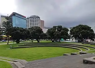 The south end of the redeveloped park consists of a covered public carpark for 99 cars with the roof of the carpark forming a large area of lawn.[1] The carpark, which also hosted an 'underground' market in the weekends, was closed in 2021 due to earthquake risk.[9][10] The north end of the park has a lawn and popular children's play area which features a lighthouse-shaped slide. The slide was closed in 2021 after three incidences of pre-schoolers breaking their legs.[11] In the central area of the park is a small amphitheatre which has been used for many public events including carols by candlelight, festivals and concerts, and is a popular lunch spot for city workers.[7] The seaward side of the park consists of a broad promenade partially bordered by a high wall between the promenade and amphitheatre. The wall was included in the 1990 redevelopment as a safety barrier for people watching the Wellington 500 car races[12] and includes spaces underneath for small retail outlets.