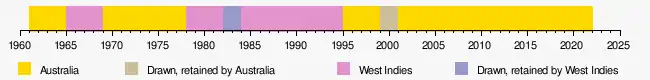 As of 2019, Australia hold the trophy following their 2–0 series victory in the West Indies 2015–16 tour.[9] Australia also lead in overall wins, winning 14 of the 24 series, while the West Indies have won 8, the remaining 2 ending in draws (with the trophy being retained by the incumbents).[1] Brian Lara is the most successful batsman in the history of the trophy, scoring 2,815 runs for the West Indies in 56 innings at an average of 52.12.[2] He also holds the record for the highest score (277) which he made in the third Test at the Sydney Cricket Ground during the 1992–93 series.[10] West Indian fast bowler Courtney Walsh has taken the most wickets in the trophy, with 135 over 38 matches, at an average of 28.68,[3] while Australia's Graham McKenzie has the best bowling figures of 8 wickets for 71 runs, achieved in the second Test of the 1968–69 series.[10] Australian Mark Waugh has taken the most catches, with 45 in 28 matches,[11] while West Indian Jeff Dujon is the most successful wicketkeeper, making 84 dismissals in 23 matches.[12]