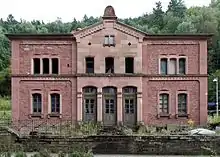 The entrance building was built during the time of the line’s construction in the Italian style of architecture as many—some replaced in the meantime—of the entrance buildings on the then Ludwig Railway.[8] It is built in the style of a Schloss (palace).[25][26] For a village the size of Frankenstein, it was architecturally very sophisticated, which was due to the fact that Denis had settled locally in the village.[27] In contrast, the entrance buildings of Kaiserslautern and Neustadt were made of wood only.[28]