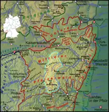 Although the House of Wittelsbach from Palatinate-Zweibrücken also had estates and titles in the Frankenweide for a time, the Leiningen head office (Oberamt) at the castle of Falkenburg near Wilgartswiesen remained administratively responsible until France conquered the Electoral Palatine territories west of the Rhine after the French Revolution in the 1790s and annexed them in 1801. Shortly beforehand, in 1785, the Frankenweide as a whole had transferred formally to the County of Leiningen.[2][3]