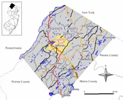 According to the United States Census Bureau, the township had a total area of 35.30 square miles (91.42 km2), including 33.88 square miles (87.74 km2) of land and 1.42 square miles (3.68 km2) of water (4.02%).[1][2] Culver's Lake and Lake Owassa, two natural lakes nestled below the Kittatinny Mountain, form the northern border. The township is located in the Kittatinny Valley which is a section of the 700-mile (1,100 km) long Great Appalachian Valley that stretches from Canada to Alabama.