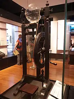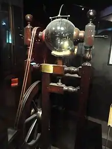Franklin's machine used a belt and pulley system that could be operated by one person turning a crank.[21] A large pulley was attached to the crank handle, and a much smaller pulley was attached to a large glass globe. An iron axle passed through the globe. This allowed the globe to be rotated at high speed.[23] When the crank was turned, the glass globe rubbed against a leather pad, which generated a large static charge, similar to the electrical charge that could be created by rubbing a glass tube with wool cloth by hand. The machine was unique improvement over others made in Europe at the time, as the glass globe could be spun faster with much less labor.[24] A few revolutions of the handle were all that were needed to charge a Leyden jar.[24][25]