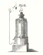 Franklin's experiments with Leyden jars progressed to connecting several Leyden jars together in a series, with "one hanging on the tail of the other". All of the jars in the series could be charged simultaneously, which multiplied the electrical effect.[32] A similar apparatus had been created earlier by Daniel Gralath. Franklin was the first to call the device an "electrical battery".[4] At that time, the word "battery" was a military term for a group of cannons.[33] Franklin was the first to use "positive" and "negative" as applied to electricity which is sometimes referred to as "plus" and "minus".