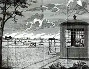 To test his theory, Franklin proposed a potentially deadly experiment, to be performed during an electrical storm, where a person would stand on an insulated stool inside a sentry box, and hold out a long, pointed iron rod to attract a lightning bolt.[15] A similar but less dangerous version of this experiment was first performed successfully in France On May 10, 1752, and later repeated several more times throughout Europe, though after a fatality in 1753 it was less frequently tried. Franklin declared that this "sentry-box experiment" showed that lightning and electricity were one and the same.[15]