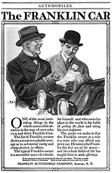 The Franklin Automobile Company was a marketer of automobiles in the United States between 1902 and 1934 in Syracuse, New York. Herbert H. Franklin, the founder, began his career in the metal die casting business before establishing his automobile enterprise.[2] Controlled by Herbert H. Franklin it had very few other significant shareholders. Franklin bought its vehicles from the H. H. Franklin Manufacturing Company which was only moderately profitable and frequently missed dividends on common stock.[3]