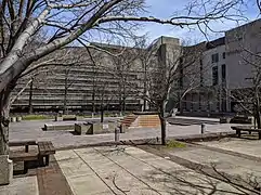 A large cast of Henry Moore's Oval with Points, originally installed in Dorrian Commons Park,[2] was moved across High Street in 2014 to the plaza of the newly-remodeled Hall of Justice.[3] The 1974 statue of Benjamin Franklin was then moved from the plaza to an interior lobby in the courthouse.