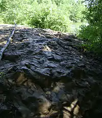There are two entrances into the preserve, leading visitors to different areas. The main entrance is just off of High Mountain Road in North Haledon, connecting to a road running across the top of the dam which impounds the lower basin pond. There is a parking lot at this entrance, a picnic area, and the start of the preserve's main path which stretches about a half mile along the east side of Haledon Reservoir.[1] A few small, unmarked trails extend west off the main path, leading to the shore of the reservoir and part of the system of dikes extending out into the water. The main path also runs through a few areas of exposed volcanic basalt, lava that erupted to the surface 200 million years ago as the super continent Pangaea rifted apart during the early Jurassic.[3][4] The largest outcrop occurs along the northeast corner of the reservoir, forming an approximately 50 foot wide ‘basalt beach’ that extends from the water's edge to the tree line.