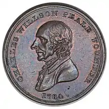 Soon after his appointment, Peale began to engage in a private business on the Mint's premises. He did this by designing, striking and selling medals for private commission, using government property and labor, and the Philadelphia Mint's facilities. Peale's enterprise was very profitable, as his expenses were minimal. This activity took place with the knowledge of the other officers of the Philadelphia Mint, most of whom were Peale's friends and relatives.[76] Clients included corporations as well as one couple celebrating a 50th wedding anniversary.[77] According to Robert E. Wright in his history of Philadelphia as an early financial center, the legality of Peale's business was unclear,[lower-alpha 5] but "the uncertainty of the situation made it almost inevitable that someone would make a stink on [Philadelphia's] Chestnut Street."[77]