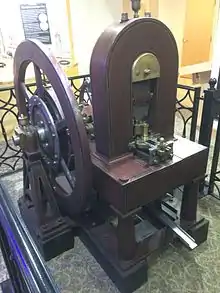 Peale returned from Europe with plans he had drawn for a steam-powered coinage press, borrowing the steam machinery design from English mints and the toggle joint technology from French ones.[42] In September, Patterson, by then Mint Director in place of the retired Moore, wrote to Secretary of the Treasury Levi Woodbury, "we have just completed under the superintendence of Mr. Peale, a model of a coining press from plans which he saw in successful operation in France and in Germany, and possessing many very manifest advantages over the Screw press now applied at the Mint. Among these one of the most important is that [it] admits the immediate and easy application of steam power."[43] Director Patterson called March 23, 1836 "an epoch in our coinage".[44] To take advantage of the new press's increased production capacity, Peale designed a new machine to cut planchets, or blanks, from metal strips.[45] This machine remained in use, almost unmodified, until 1902.[46]