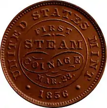 The first pieces produced by steam power at the Philadelphia Mint, commemorative medals, were struck on March 23, 1836. The first steam press there then began minting cents, with silver and gold coinage first struck there by steam towards the end of the year.[47] Built by the Philadelphia firm of Merrick, Agnew, and Taylor to Peale's design, the press was able to coin 100 pieces per minute. After being retired from government service, the press was used at The Franklin Institute to strike miniature medals for many years, and in 2000 was moved to the American Numismatic Association's Money Museum in Colorado Springs.[48] Patterson wrote,