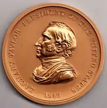Peale sometimes worked on medals for the government,[84] taking care to exclude Longacre from the process.[85] During the Mexican–American War, Congress voted a gold medal to Major General Zachary Taylor for his victories at Palo Alto and Resaca de la Palma. Peale engraved the design from a portrait by William Carl Brown and a model by John T. Battin. After Taylor became president, Peale designed his Indian Peace Medal; Peale also engraved Indian Peace Medals for presidents John Tyler and James Polk, working from designs or models by other men. In 1846, Peale designed and engraved the Coast Survey Medal (also called the George M. Bache medal).[84] Peale believed that all national commemorative medals, those authorized by Congress, should have their dies lodged at the Philadelphia Mint, and be struck there, and with Patterson's support urged the issuance of medals for presidents for whom no Indian Peace Medal had been designed, such as John Adams and William Henry Harrison. This was done, but not in Peale's time—for example, the William Henry Harrison medal was designed by later Assistant and Chief Engraver George T. Morgan. These works, like Peale's Indian Peace Medals, form part of the Mint's Presidential series, which continues to the present day.[86]
