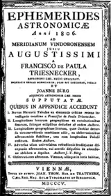 Triesnecker was born in Mallon, Kirchberg am Wagram, Austria. When he was 16 he joined the Society of Jesus. He studied philosophy in Vienna and mathematics at Tyrnau, then became a teacher. Following the suppression of the Jesuits in 1773, he moved to Graz to complete his studies in theology, and was ordained soon after his graduation. In 1782 he became assistant director of the Vienna Observatory and 1792 succeeded Maximilian Hell as director. He remained in this post for the rest of his life.[1][2] In 1794 he was elected Foreign Member of the Göttingen Academy of Sciences and Humanities.[3]