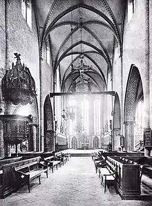 Extensive renovations were carried out in the first half of the 19th century - the gabled tower was demolished in 1826, two new towers were built on the west side in 1842, a new sacristy was built and the floor lowered again. Plans were produced for the work by Karl Friedrich Schinkel, Christian Gottlieb Cantian and the former track-inspector Berger was preceded by the construction work - Berger's second design was that ultimately implemented. Work lasted until 1845, though the church was closed due to severe damp in its masonry in 1902 and in 1926 most of the 19th century changes were reversed. The church was re-consecrated on 24 May 1936.