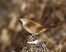 The freckle-breasted thornbird is similar to the greater thornbird in habits. Usually seen in pairs, it forages in the undergrowth and in more open marshy habitats for insects including beetles and scale insects.[5] The nest is a bulky, gourd-shaped structure with a long, curved entrance tunnel, built on a branch or in a tree fork.[6] Eggs are laid between August and January, and it is possible that there are two broods.[5]