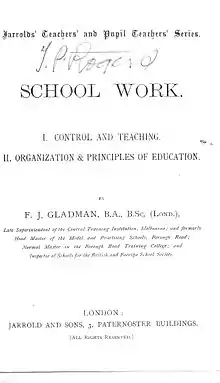- School Work Control and Teaching Organisation and Principles of Education by FJ Gladman published Jarrold and sons 1886