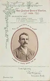 He established a local chapter of the Knights of Labour, and in 1890 stood for Parliament as a Labour candidate, losing by only 61 votes.[3] He was persuaded to stand again by John Ballance, and was elected as a Liberal in 1893. He would hold the seat until 1902, but the change in the Liberal platform under Richard Seddon led him to gradually break with the party.[1]