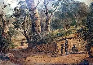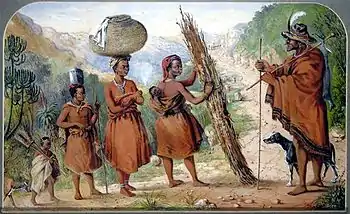 The patrons of I'Ons were largely military types who commissioned portraits of the local Xhosa chiefs, such as Sandile and Khama. I'Ons was outstanding in depicting the Bantu and Hottentot passers-by. The images of these 'native characters' are regarded as his most important works, reflecting a great deal of sensitivity and skill in their portrayal, and likened to those of Adriaen van Ostade.[1] As is often the case with artists who have to produce potboilers to survive, their best work is neglected in the interests of financial exigencies.[2]