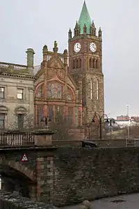 Derry City lies near the border between Northern Ireland and the Republic of Ireland. It has a majority nationalist population, and nationalists won a majority of seats in the 1920 local elections. Despite this, the Ulster Unionist Party controlled the local council, Londonderry Corporation, from 1923 onwards.[2] The Unionists maintained their majority, firstly, by manipulating the constituency boundaries (gerrymandering) so that the South Ward, with a nationalist majority, returned eight councillors while the much smaller North Ward and Waterside Ward, with unionist majorities, returned twelve councillors between them; secondly, by allowing only ratepayers to vote in local elections, rather than one man, one vote, so that a higher number of nationalists, who did not own or rent homes, were disenfranchised; and thirdly, by denying council housing to nationalists outside the South Ward constituency. The result was that there were about 2,000 nationalist families, and practically no unionists, on the housing waiting list, and that housing in the nationalist area was crowded and of a very poor condition.[3] The South Ward comprised the Bogside, Brandywell, Creggan, Bishop Street and Foyle Road, and it was this area that would become Free Derry.[4]