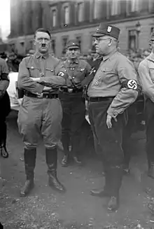 Klagges was instrumental for the dismissal of opposition public servants and in organizing the anti-democratic Harzburg Front in October 1931. He is especially known for naturalizing the former Austrian citizen Adolf Hitler, who had been stateless for seven years and aimed to run in the 1932 German presidential election.[11] After the failure of a first attempt to obtain him a tenure at Braunschweig University of Technology, Minister Klagges finally managed to appoint Hitler as a public functionary at the Brunswick delegation to the Reichsrat in Berlin in 1932, which gave him citizenship of Brunswick, and thus automatically of Germany.[12] There are no records of any activity by Hitler in this (high-paid) position. After his appointment as Reich Chancellor on 30 January 1933, he was officially dismissed.