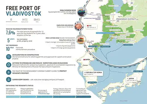 The Free port of Vladivostok is a free port, which means a port zone under a special custom and taxation system, with a particular jurisdiction regarding investments. This status has been granted to Vladivostok from 1861 to 1909, and since October 12, 2015.