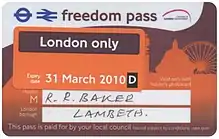 Freedom Pass is a concessionary travel scheme, which began in 1973, to provide free travel to residents of Greater London, England, who are aged 66 and over (the age of eligibility increased progressively from 60 in 2010 to 66 in 2020) or who have a disability. The scheme is funded by local authorities and coordinated by London Councils. Originally the pass was a paper ticket, but since 2004 it has been encoded on to a contactless smartcard compatible with Oyster card readers.