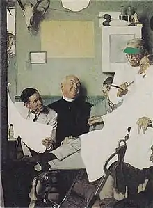 The original version of the painting was set in a barbershop with patrons of a variety of religions and races all waiting their turn in the barber's chair.[12] His first workup was a 41-by-33-inch (104 cm × 84 cm) oil on canvas depicting tolerance as "the basis for a democracy's religious diversity". It included a Jew being served by a Protestant barber as a black man and a Roman Catholic priest awaited the barber's services.[13] The problem was painting easily recognizable depictions of different religions and races because there was little agreement on what a person of a certain religion should look like.[14] However, as he attempted to clarify the characters' depictions he found himself resorting to offensive overexaggeration, especially of the non-clerical characters. Making a Jewish man appear stereotypically Semitic, making a white customer preppy and relegating the black man to agrarian workman attire bogged down the work without speaking on behalf of the government as it should.[15] Rockwell's intended theme was religious tolerance, but he felt the original composition did not successfully make this point.[10]