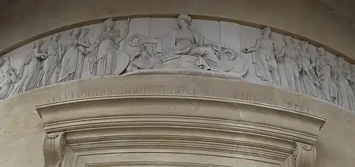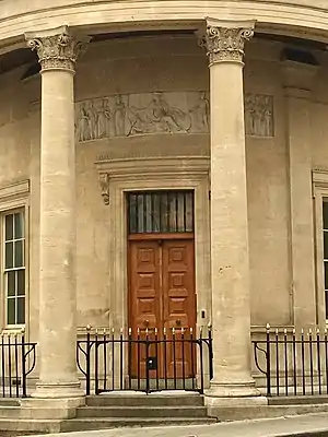 Built from limestone with a copper-clad roof, Freemason's Hall is sited on the corner of Park Street and St Georges Road in Bristol. The main entrance to the building is elevated behind cast iron railings with a gate and bud finials and is surmounted by an interesting frieze depicting a classical Greek scene by EH Baily.[9] This opens into a circular reception area which in turn leads to the lounge and main staircase of the building with access to all floors.