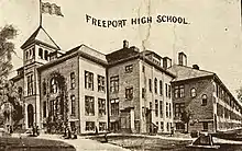 A new high school was constructed[1] immediately east of the old one in 1922–1925.[1] 1925 was also the beginning of John W. Dodd's tenure as superintendent of Freeport schools; he would serve in that office until 1961.[1] Another longstanding figure in the school system was Leo F. Giblyn, a World War I veteran who served on the Board of Education from July 1, 1932, until his death on December 19, 1960; from July 1, 1940, onward he was board president. In 1962, an elementary school was named in his honor.[3]
