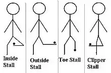 - Clipper or Jester (Chester) stall: The kicking foot is positioned behind the standing foot, and caught on the inside of the foot as in an inside stall. the name jester is often used by circle kickers.