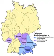 The Freising Bishops' Conference was founded in 1850. In it the bishops of the Archdiocese of Munich and Freising in southern Bavaria, with the suffragans of Regensburg, Passau and Augsburg as well as the Franconia Archdiocese of Bamberg with the suffragans of Würzburg, Eichstätt and Speyer are represented. The bishops of these dioceses meet since 1867 twice a year at the Freising cathedral hill, its leader, the Archbishop of Munich and Freising (since 2008 Archbishop Reinhard Marx); Substitute is the Metropolitan of the northern Bavarian ecclesiastical province of Bamberg (since 2002 Archbishop Ludwig Schick). The territory of the diocese of Speyer, although now part of the federal states of Rhineland-Palatinate and Saarland, the boundaries of the Province of Bamberg are unchanged since 1920/1945 - with the exception of the assignment of Thuringia areas of the diocese of Würzburg in the diocese of Erfurt - which is why the Palatinate canonically continues to be a part of Bavaria. The Freising Bishops' Conference has the mission to promote common pastoral duties to coordinate the church's work and provide a platform for mutual consultation. Unlike the German Bishops' Conference, supported by the Bavarian bishops in 1933, it has no decision making powers.