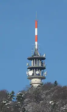 Fremersberg Tower (German: Fremersbergturm) is an 83-metre-tall (272 ft) telecommunication tower built of reinforced concrete with an observation deck 30 metres above ground. There is a small restaurant located next to the tower. Fremersberg Tower, which was built in 1961 is situated on 525-metre-high (1,722 ft) Fremersberg near Baden-Baden at 8°12'8" E and 48°45'10" N.