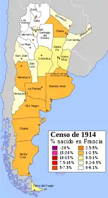 According to the 1869 census, a quarter of immigrants to the province of Mendoza were from France. In 1895, they made up 15% of immigrants of the province, right after Italians and Spaniards (26.1% and 17.3% respectively). Frenchmen were particularly numerous in the wine-producing departments of Maipú, Luján and in the French colony of San Rafael, founded by engineer Julio Gerónimo Balloffet.[19]