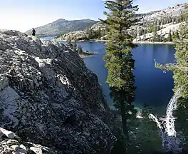 French Lake Reservoir, at an elevation of 7500’-6680’,[2] is part of a string of lakes, including Bowman Lake, Sawmill Lake, and Faucherie Lake to the northwest, as well as Meadow Lake and Fordyce Lake to the southeast. French Lake Road, used by the Nevada Irrigation District and not available for public use, skirts the lake's northwest perimeter before heading east to Meadow Lake Road. An unsigned road near the lake's southeastern banks veers northeast to Meadow Lake Road above English Mountain's now uninhabited Baltimore Town and Summit City in unincorporated Nevada County.[3][4]