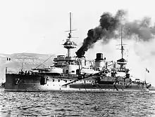 During exercises off Golfe-Juan on 31 January 1903, Gaulois accidentally rammed Bouvet. The latter was barely damaged, but Gaulois lost two armour plates from her bow; both captains were relieved of their commands.[12] Captain (Capitaine de vaisseau) Pierre Le Bris assumed command of Gaulois on 20 March.[13] In April 1904, she was one of the ships that escorted Loubet during his state visit to Italy. Later that year, the ship made port visits in Thessaloniki and Athens, Greece, with the rest of the Mediterranean Squadron. A wireless telegraph was installed aboard Gaulois in December 1905. Together with the battleships Iéna and Bouvet, the ship aided survivors of the April 1906 eruption of Mount Vesuvius in Naples, Italy. On 16 September she participated in an international naval review in Marseilles, together with British, Spanish and Italian ships.[14]
