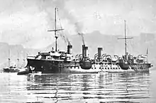 Bugeaud was transferred to the Levant Division in 1897, but engine problems forced her to return to Toulon for repairs, her place in the division being taken by the cruiser Suchet. Bugeaud was reassigned to the Mediterranean Squadron after repairs were completed later that year.[9][10] She was still in service with the squadron in 1898.[11] Later that year, she was deployed to the coast of Ottoman Syria, where she relieved Amiral Charner as the flagship of the Levant Division. The unit at that time also included the torpedo cruisers Vautour, Faucon, and Condor. The divisional commander at the time was Vice Admiral Édouard Pottier. During this period, she served with the International Squadron that intervened in the Cretan Revolt. She carried Prince George of Greece and Denmark to Crete, where he became the High Commissioner of the Cretan State, part of the negotiated settlement to the conflict. The International Squadron was thereafter disbanded.[13]