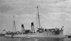 Cassini was assigned to the cruiser division of the Northern Squadron in 1897, along with a pair of armored cruisers, the protected cruiser Friant, the torpedo cruiser Epervier, and two torpedo gunboats.[9] She remained in the unit the following year.[10] The ship initially remained in the unit in 1899,[11] and she took part in the annual maneuvers in July and August that year.[12] Later that year, she was withdrawn from service to have one of her torpedo tubes removed.[5] After returning to service in 1900, Cassini returned to the Northern Squadron,[13] where she remained through 1901.[14] That year, the annual fleet maneuvers were conducted from 3 to 28 July. During the exercises, the Northern Squadron steamed south for joint maneuvers with the Mediterranean Squadron. The Northern Squadron ships formed part of the hostile force, and as it was entering the Mediterranean from the Atlantic, represented a German squadron attempting to meet its Italian allies. In August and September, the Northern Squadron conducted amphibious assault exercises. On 28 August, they escorted a group of troop ships from Brest to La Rochelle. The ships conducted a simulated bombardment of the port, neutralized the coastal defenses, and put some 6,000 men ashore.[15]